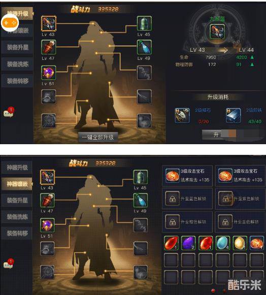 神器的升级可以全面的累积属性,大量提高战斗力和生存力。,如果你想把游戏玩的很厉害,唯一看的就是你的战力,神器前期先提升,到一定级数,卡一下系统会提醒你,给神器用砖头升级,这时你有砖头就不要乱用了,留着因为你后面还有好几个装备呢。再者还有宝石,前期有低阶的宝石镶嵌到神器里,宝石是带一定属性的,要学会使用和收集,等到神器提升到一定的等级,就可以把几个低阶的宝石一起合成高阶的再给神器镶嵌上。