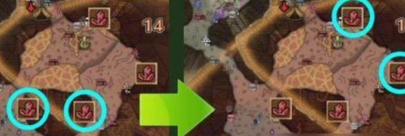 采集点:在聚魔之地里面,除了荒地地带有六个矿脉采集点外,其它五个地区都是四个矿脉采集点。而在这四个采集点中,会随机的在两个采集点出现矿脉,一段时间后,这两个采集点的矿脉会消失,另外两个采集点的矿脉会出现。以火山地带为例,若是初期矿脉出现位置为左图的采集点,而一定时间经过后,则左图的两个矿脉点消失,替换成右图的两个采集点出现矿脉。
