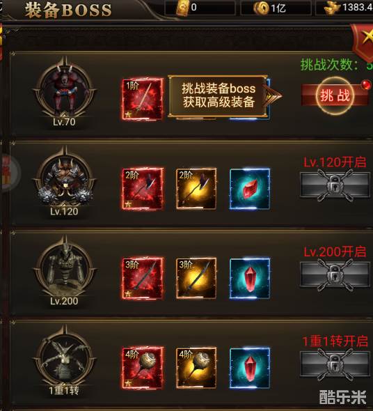 完成游戏中的boss挑战任务,可免费获取高级装备,装备全靠打,效率相当高!