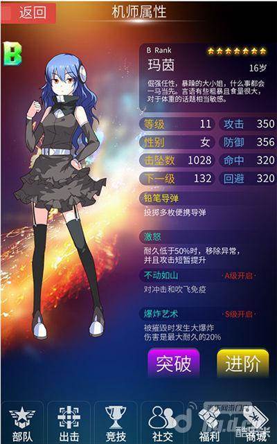 我们这位玛茵机师,身怀绝技,铅笔导弹技能虽听着很书卷气,但是可投掷多枚便携导弹,在初始时期还是十分管用的;激怒必杀可在耐久低于50%时,移除异常,并且让攻击得到短暂提升,真是如名字一般荡气回肠,简单,实用,任性;而在A级开启的不动如山,大大的增强了稳定性,对冲击和吹飞免疫;爆炸艺术可谓是将美发挥到了极致,被摧毁的同时发生大爆炸,伤害量最大达耐久的20%,死也要像绚烂的烟火,虽然此技能要到S级才能开启,但是这么美的技能,为什么不期待下呢?玛茵机师的技能和头像搭配的真是完美,微胖的妹纸发起脾气那是相当不得了!