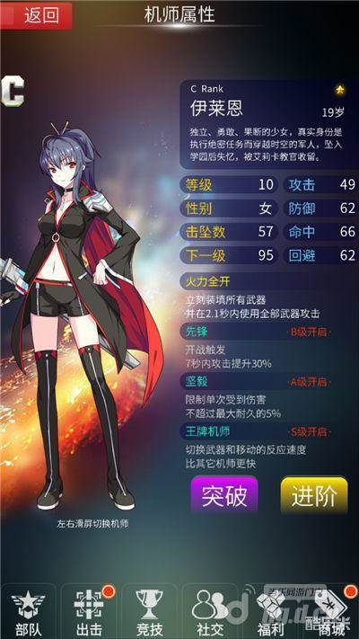 独立、勇敢、果断的少女,性格和御姐外形贴合十分准确,真实身份是执行绝密任务而穿越时空的军人,坠入学院后失忆……种种迹象表明,伊莱恩不是个简单的妹纸,一定有着强大的技能。火力全开,立刻装填所有武器,并在2.1秒内使用全部武器攻击,瞬间攻击力增倍提升;先锋,开战触法,7秒内攻击提升30%;坚毅,限制单次收到伤害不超过最大耐久的5%;王牌机师,切换武器和移动的反应速度比其他机师更快。攻击提升,伤害限制,切换神速,这些技能都在告诉玩家,伊莱恩就是你不二之选,女特种兵附体的超能萌妹。