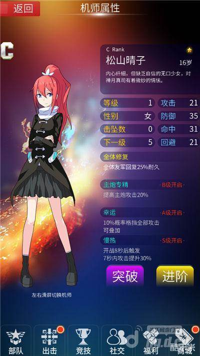 外表甜美的松山晴子内心纤细,但缺乏自信,这样默默掩饰倾诉的萝莉,一定是辅助型机师。全体修复,可为全体友军回复25%耐久;主炮专精,提高主炮攻击20%;幸运,10%概率格挡全部攻击,并且可叠加;慢热,开战8秒后触法,7秒内攻击提升30%。如此技能,排在后面为队友做辅助,再好不过了。