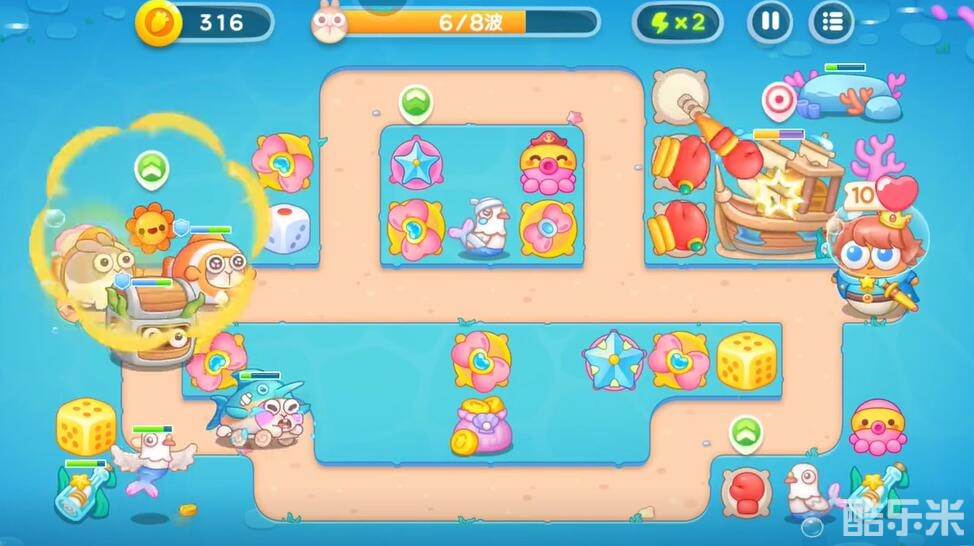 4、在左侧和右下角各建造一个骰子,对障碍物进行输出,同时在中间偏右上的位置建造一个章鱼攻击兔子。