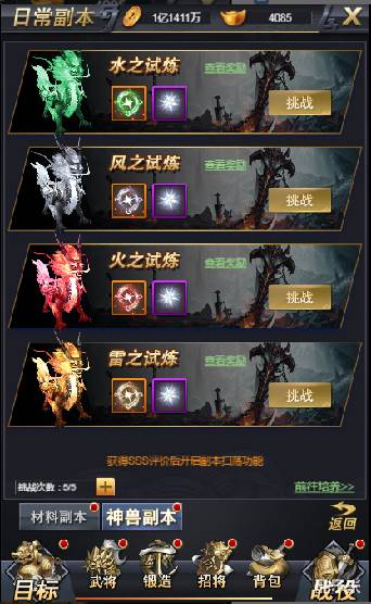 神兽副本分为四个试炼之地,每个试炼之地都产出通用材料上古晶魂