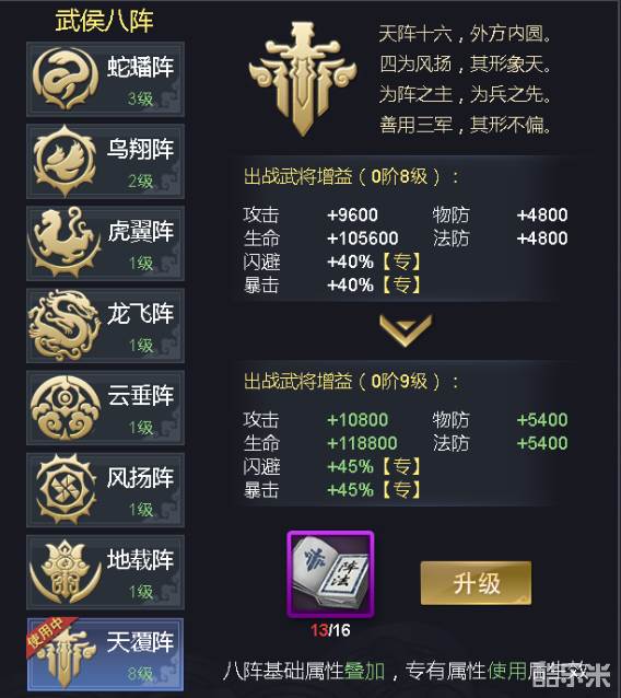 游戏中一共有八种阵法(俗称武侯八阵),每个阵法都可以消耗阵册进行升级。升级更可获得属性加成喔。