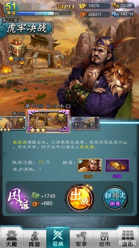 征战系统是整个游戏的核心剧情玩法,按照一定的剧情和故事关联分为多个大章,每章又分为普通、精英、BOSS等多种关卡,是玩家获得国力经验、武将碎片、士兵碎片、印绶的绝佳路径。
