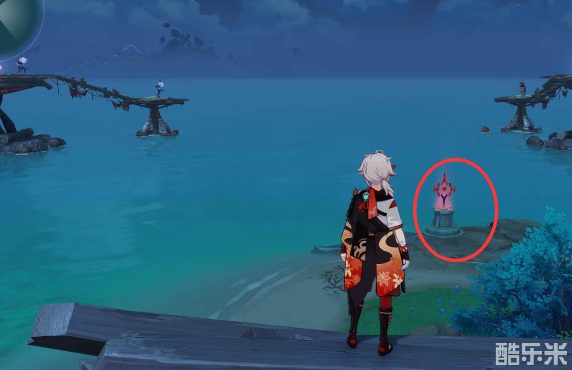 1、首先乘着浪船来到茂知之壳的旁边,可以看到附近有雷柱子;