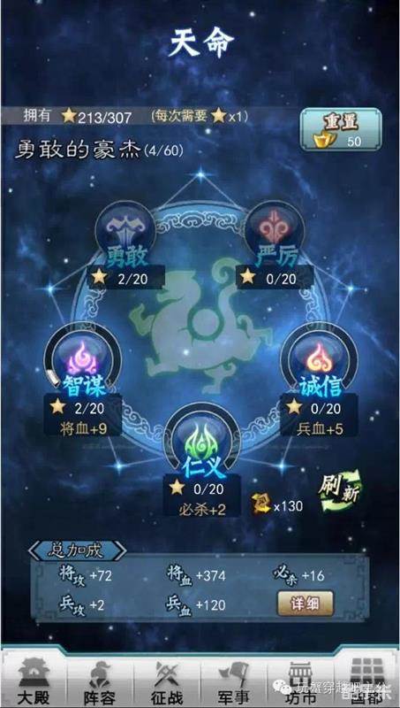 天命攻分为5中属性:将攻、将血、必杀、兵攻、兵血。每次开始时,会随机出三个选项可以进行选择消耗星星,玩家直接点击消耗星星,增加对应属性。然后马上随机 刷出另外3个属性。当前等级星星消耗达到要求时,直接升到下一级,同时解锁一个技能。