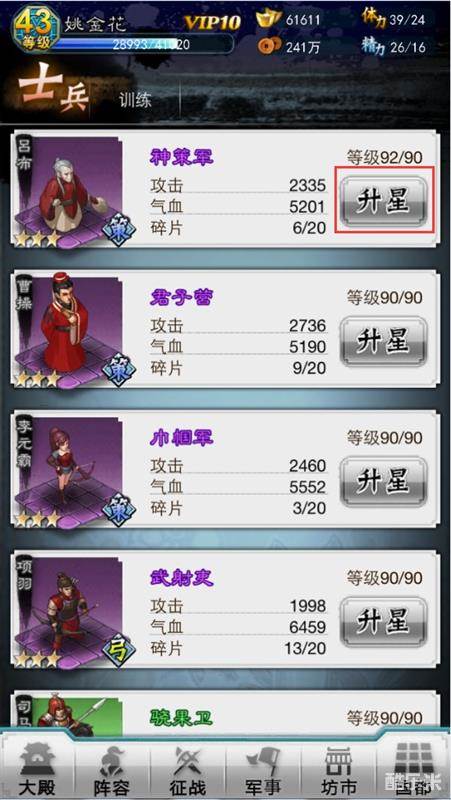 1) 每次对兵种进行升星都需要消耗一定数量的同名兵种碎片