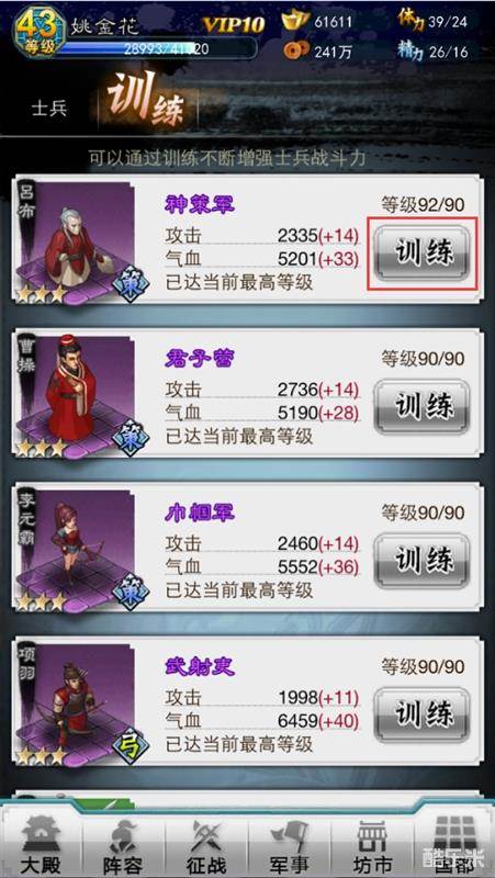 3.玩家通过消耗银币和练兵点来随机选择提升各个兵种属性
