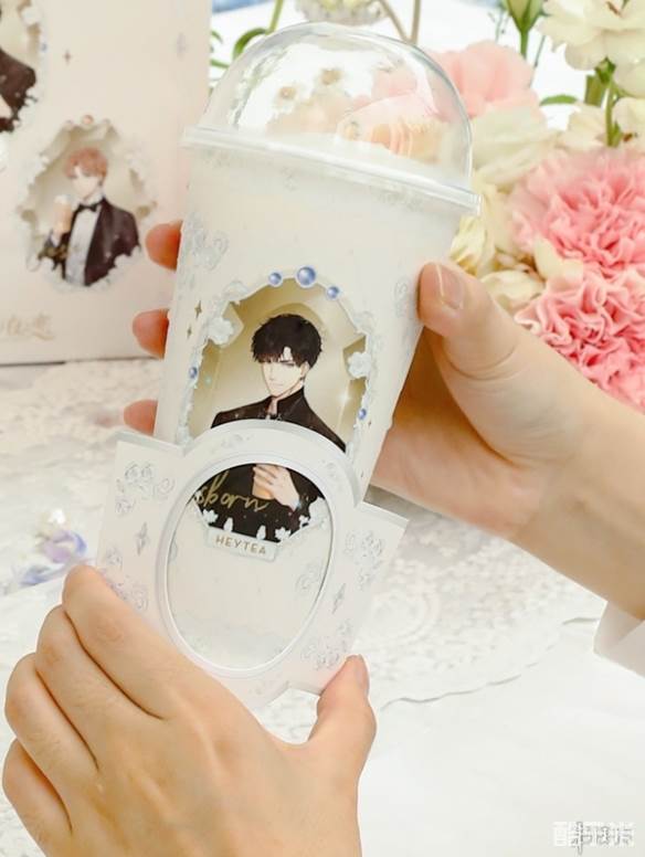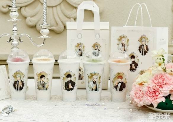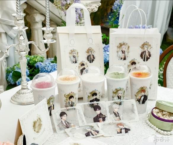 此外,联名饮品统一采用白色的人物定制杯,杯身上同时体现角色形象与名字,而定制的镂空杯套则结合烫金工艺,进一步体现誓约般的典雅与庄重质感。此外,喜茶还同步推出集合角色西装正式造型的白色情人节主题联名纸袋、保温袋,以营造更加完整的联名饮品体验。