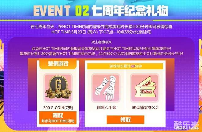 而在此次派对的重头戏中,PUBG迎来了七周年纪念。在七周年当天,也就是3月23日,为了庆祝这一重要时刻,游戏特别推出了HOT TIME时间活动。在下午7点~10点59分的时间段内,游戏时长累计20分钟就能获得全新的奖励——暗黑心手套和抽奖券两张。这一奖励不仅具有极高的收藏价值,还能在游戏中为玩家们增添一份独特的魅力。除此之外还有登录就能获得的300G-COIN。
