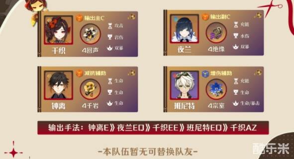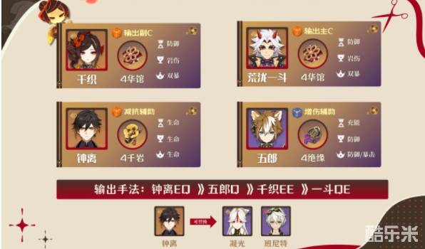 此队主打岩队的暴力美学,对—斗和千织的练度要求比较高;同时纯岩队也不方便破盾。此外,千织在EE切人进—斗时,注意不要用掉一斗的E,否则会减少—定的伤害。