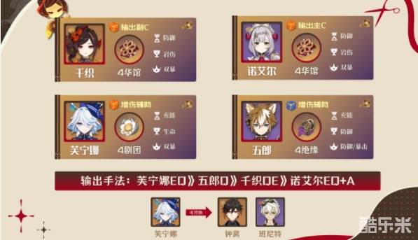 该配队主要围绕芙宁娜与诺艾尔展开,通过诺艾尔自回血来抵消芙宁娜的烧血机制,获得高额增伤。同时诺艾尔生存能力较强,在前台不易出现血线较低的情况,三岩也能有效缓解诺艾尔的充能需求。