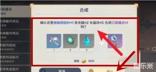2、获得图纸后,玩家需要前往提瓦特任一合成台进行合成。消耗的材料包括1个地脉的枯叶、2个发光髓和5个水晶块。请注意,这些材料中发光髓可能相对较难捕捉,其他材料则相对容易找到。