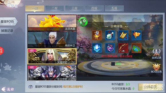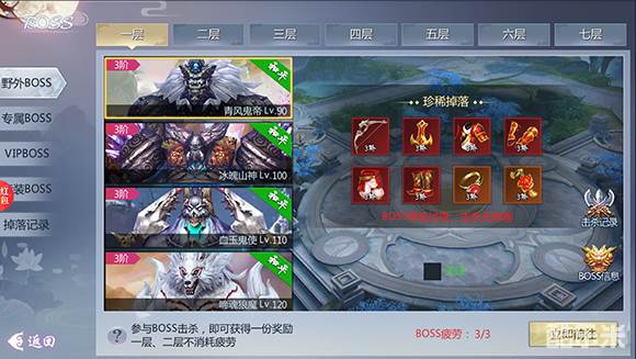 三层以上为竞争层,可以PK,击杀BOSS将增加BOSS疲劳1点,玩家可以选择组队,对BOSS造成最高伤害的队伍获得BOSS归属权,队伍所有成员都可各自获得1份BOSS奖励。