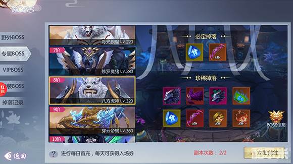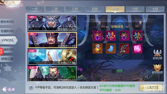 VIP BOSS玩法在150级开启,掉落少量装备,同时也是产出法宝外观道具的最主要途径。