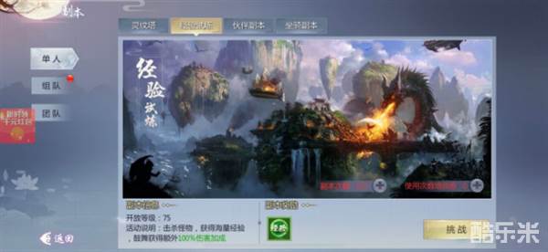 玩家在75级将会解锁经验副本,这个的时候需要注意了,如果你是开服冲级的降妖师,建议将经验副本留在最后再打,因为怪物随着降妖师的等级提升而变高,等级越高收益越高。开打时记得嗑药啊!