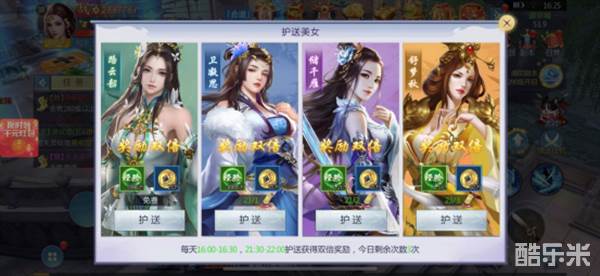 护送美人任务等双倍时段再做,千万不要在刚解锁的时候做,会错失很多经验的。每天仅能做三次,消耗的护送令牌越多,经验越多。换个想法,相当于同时护送了两位美人,岂不美哉?嘿嘿~