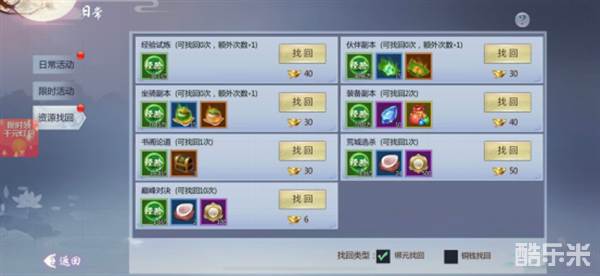 资源找回能够找回大部分资源,但小五还是建议降妖师们主动参与相关活动,领会其中的乐趣。玩家能够使用绑定元宝和铜钱找回,绑定元宝不足时可消耗元宝找回。日常活动可累计找回2天的资源,周常活动可累计找回1周的资源。
