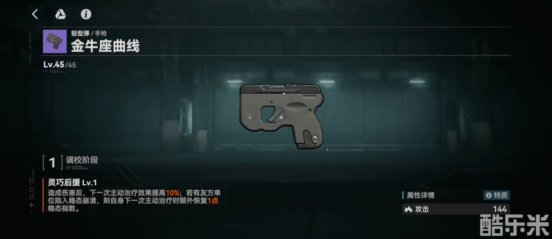 上述信息就是有关于少女前线2追放金牛座曲线武器介绍的详细资讯了,这个武器在造成伤害后,下一次主动治疗效果提高10%,若有友方单位陷入稳态崩溃,则自身下一次主动治疗时额外恢复1点稳态指数。