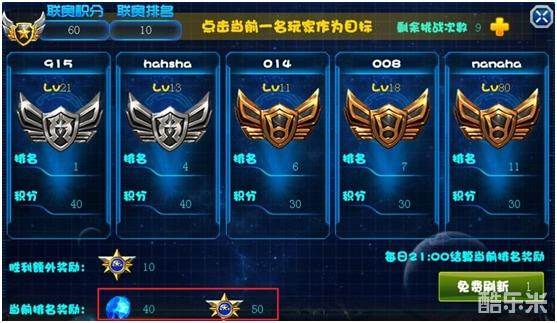1、在屏幕的左侧点击“联赛”按钮,然后进入匹配界面选择一个玩家就可以战斗了。在选择玩家时,会看到当前玩家的排名和胜利后所获得的积分。