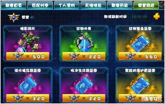 3、联赛荣誉商店:挑战其他玩家胜利和每日排名都会获得荣誉。荣誉可以在荣誉商店里兑换需要的:机甲碎片、强化水晶、蓝图、材料等。