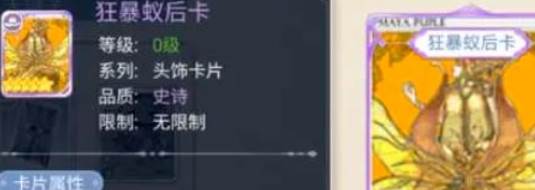 首先给大家推荐的就是狂暴蚁后卡,这是一个头饰的卡片,虽然是史诗的品质,但是也是大家比较容易获取的一张卡,能够提高大家的魔法能力,游戏前期的时候可以考虑把这个卡片插到卡槽里,后续再蹲一蹲金色的卡。