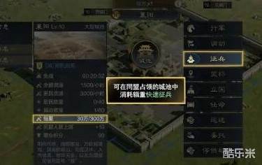 首先我们来看看同盟城池内快速征兵。将军队调动至同盟城池中,然后指令中选择征兵,即可消耗辎重和主城预备兵进行快速征兵。不需要消耗时间,可以飞速补兵然后重新投入战场,这对战况瞬息变化的战场来讲十分的有帮助。