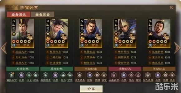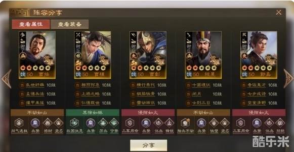 本套阵容的玩法思路主要以DOT伤害为主,包含【断粮】、【溃逃】、【流血】、【中毒】等多种异常状态,再结合武将本身强度以及曹植【坚韧】的BUFF,坦度相当之高,是一套能够和敌军打持久战的新阵容。