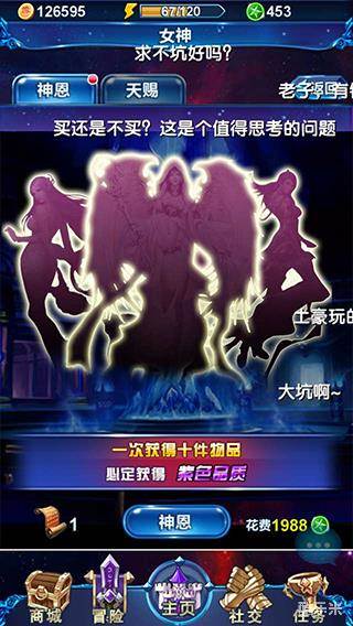让我们来看看这个良心的10连抽吧。不像别的游戏一来二十分钟内必让你看到十连抽,大R一抽角色牌,全部人都输在起跑线了,但《男神女神》神恩(10连抽)相对就比较良心了。神恩10连抽,要队伍达到一定的34级以后才会开放。而不是一开始就直接引导你冲动消费,我们希望更多玩家沉淀下来,一起好好经营这个虚拟的世界,而不是通过金钱碾压把玩家分成三六九等。而且,神恩性价比相对较高,但出的物品绝对高价值,紫色装备,锻造材料,紫色进阶牌都会获得。。。。运气好,哪天人品爆发,来一发!角色进阶需求通通搞定了!我们不仅仅考虑了消费型玩家,更为非R玩家提供了神恩的机会?首先我们有个完成卡牌上阵的任务,当你完成了上阵牌的任务以后就可以免费获得1张神恩卷啦。