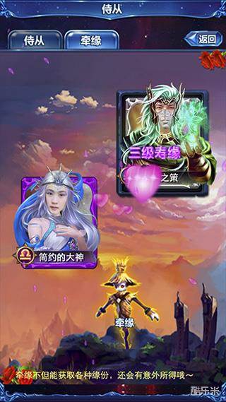 l 过了引导的时候,当您缺少侍从的时候,请进入主界面侍从的场景里(主场景大殿堂的左侧)进去有2个页签,侍从 和牵缘。