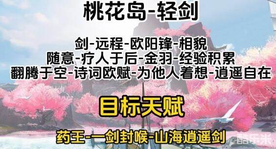 目标天赋:药王、一剑封喉、山海逍遥剑,可以让你更好的用轻剑进行远程的输出,提供了及其优质的输出能力。