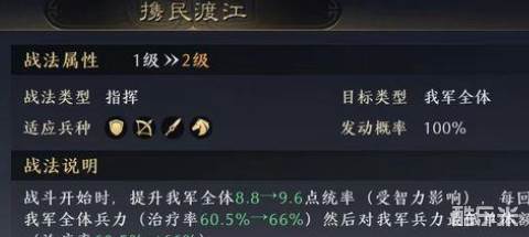 2、战法效果:携民渡江主动类型技能,战斗开始时,提升我军全体9→18点统率(受智力影响),每回合结束时,恢复我军全体兵力(治疗率50%→100%6),然后驱散我军兵力最低单体1种负面状态,并对其额外进行1次恢复(治疗率45%→90%)。