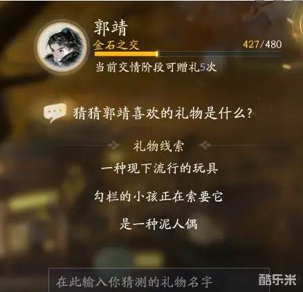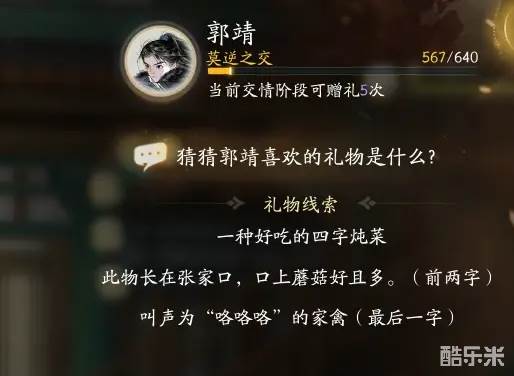 《射雕》是网易游戏推出的一款全新大世界武侠冒险RPG手游,游戏今日就要正式公测了,那么大家想必需要了解更多游戏知识哦!游戏中我们可以结识不同的侠客,赠送对应的礼物可以提升他们的好感度!其中射雕郭靖喜欢的礼物是什么呢?今天酷乐米小编给大家带来了《射雕》郭靖喜欢礼物线索大全分享,一起来看看吧!
