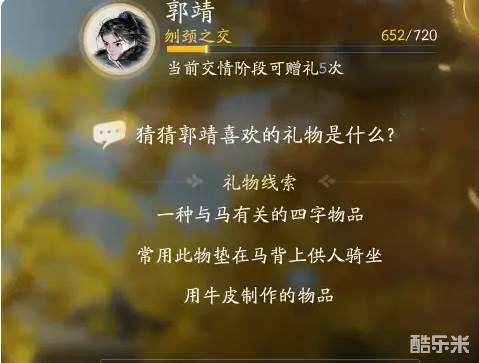 射雕郭靖礼物线索:弦蜡、马奶娘、磨喝乐、巨胜奴、鹿皮马鞭、牛皮马鞭、蒙古弯刀、口磨炖鸡、金疮药、夜晚狼齿吊坠。
