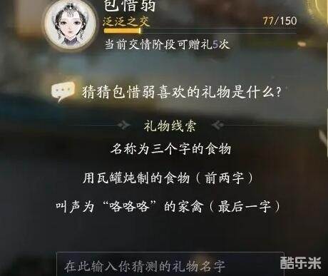 《射雕》是网易游戏推出的一款全新大世界武侠冒险RPG手游,游戏今日就要正式公测了,那么大家想必需要了解更多游戏知识哦!游戏中我们可以结识不同的侠客,赠送对应的礼物可以提升他们的好感度!其中射雕包惜弱喜欢的礼物是什么呢?今天酷乐米小编给大家带来了《射雕》包惜弱喜欢礼物线索大全分享,一起来看看吧!