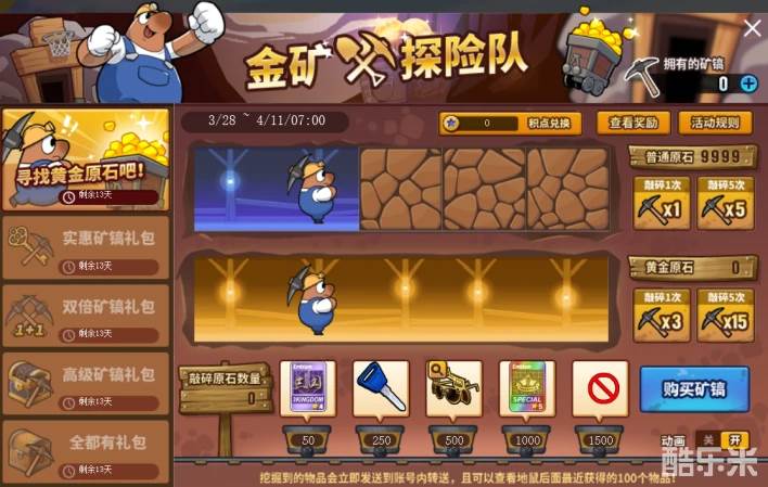 使用矿镐敲碎原石后可以获得各种物品。在敲碎普通原石时有概率得到黄金原石。获得的黄金原石会移动到下方的金矿里。因为黄金原石更坚硬,所以需要使用更多的矿镐才能得到宝物。