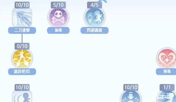 1、一转点施毒、二刀连击和闪避护盾,残影和隐匿,可以让我们获得潜行,通过施毒来进行输出。