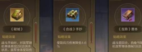 解锁之后会随机出现三本不同的策略,可以随意选择并自由切换。超滤共分为4种不同的品质,包括绿色、蓝色、紫色、橙色,橙色只有武将才能够获得。每个韬略的加成效果是完全不同的,一般等级越高,加成属性也就越高,让人家在战斗过程中拥有更好的输出效果。