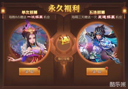 每日活跃度达到100的玩家,即获1次价值100元的五连抽武将招募机会,两周共可领取14次五连招募。玩家在线一定时长,即可参与抽奖活动,赢取价值一千元人民币的道具大礼。武将惊喜连连不断,一统天下指日可待