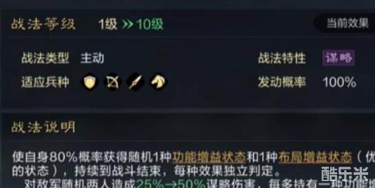 2、战法—鹰视狼顾:使自身有80%概率随机获得一种功能增益状态,以及一种布局增益状态(该效果会优先获得不同的状态),效果能持续到战斗结束,同时每种效果独立判定。伤害效果为对敌军随机两人造成50%谋略伤害,每多持有一种功能增益和布局增益状态,谋略系数提升20%。能提供的增益状态未清醒、精准、抵御,以及五种布局增益有。