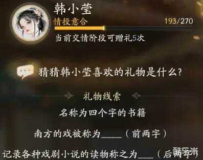 射雕韩小莹喜欢的礼物是什么呢?韩小莹是神雕里的人物,许多人都好奇韩小莹到底要送什么样的礼品才能攻略,下面就是射雕中韩小莹最喜爱的礼品介绍,一起看看吧。