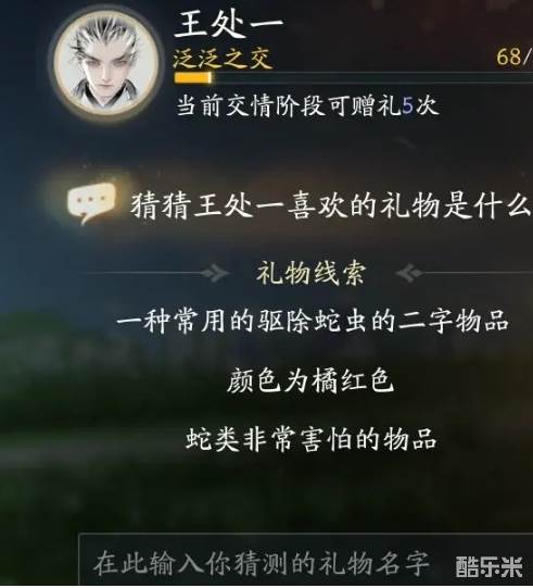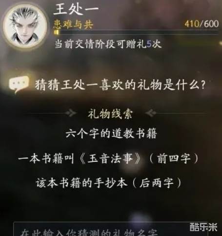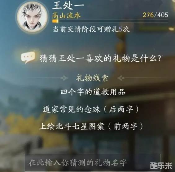 《射雕》手游中每个侠侍都有自己喜爱的礼物,但是很多小伙伴不知道王处一喜爱的礼物有什么,王处一喜爱的礼物有:七星念珠、玉音法事抄本、平安扣等等,接下来酷乐米小编为玩家带来的射雕王处一喜欢礼物大全,感兴趣的玩家快来一起看看吧!