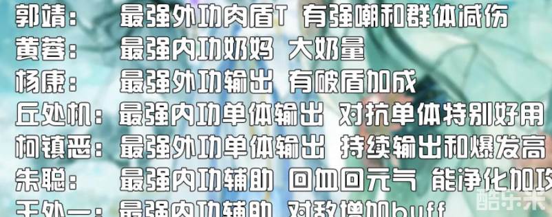 黄蓉开服三境送,前期可以用全金发,包惜弱过度。丘处机单杀可以,新手池出了丘处机,签到14天就选杨康,同样出了杨康就选丘处机。