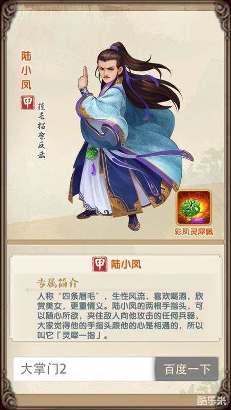 当代武林奇才,两指间的绝技世上无人能及,据说他可仅凭两指指力接住天下任何一剑。像极了两条眉毛的八字胡是他的标志,为人极为珍惜与朋友的友谊。陆小凤在游戏中的真气招式是他名震江湖的神技“灵犀一指”,招式收发间自身招架几率提升30%,并持续一回合。