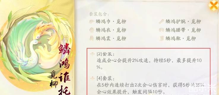 2、四件套:若玩家在五秒内连续造成2次会心伤害,提升自己的会心效果,该效果持续5秒。