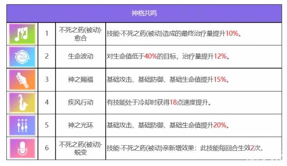 回合结束时,治疗生命值比例最低的友方,治疗量为目标最大生命值6%,净化目标1个减益。