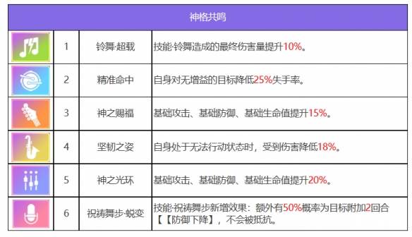 回旋曼舞能为敌方附加【禁疗】和【烙印】,觉醒后在攻击敌方全体目标的同时附加【攻击下降】,还会为我方全体附加【神乐之舞】,提升我方的伤害以及我方受到治疗的效果。