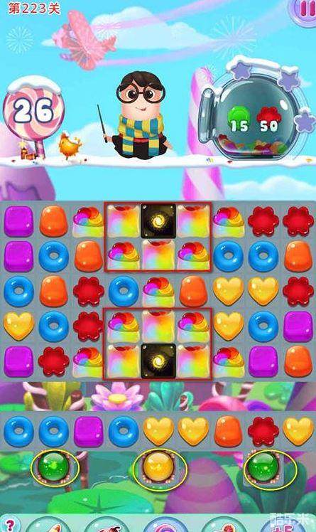 宾果消消乐223关主要任务是收集15个绿色糖果,50个红色糖果。这一关的任务所需要的红色糖果其实很容易获得,在上方的区域就可以看见。而绿色的糖果却需要玩家使用糖果受到变色水晶球的影响才会得到。那么如何让糖果受到变色水晶球的影响呢?很大的希望就寄托在了变色旋涡上。下面我们一起来看一下宾果消消乐223关的通关攻略吧。